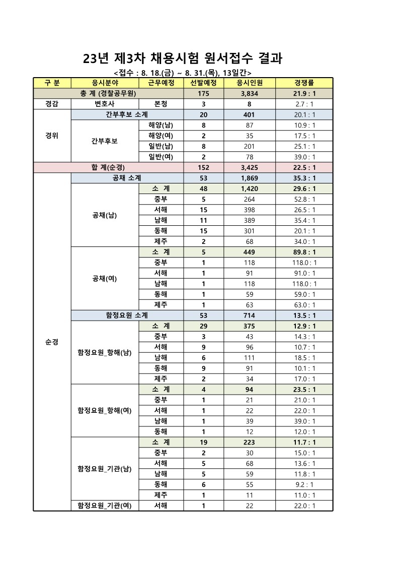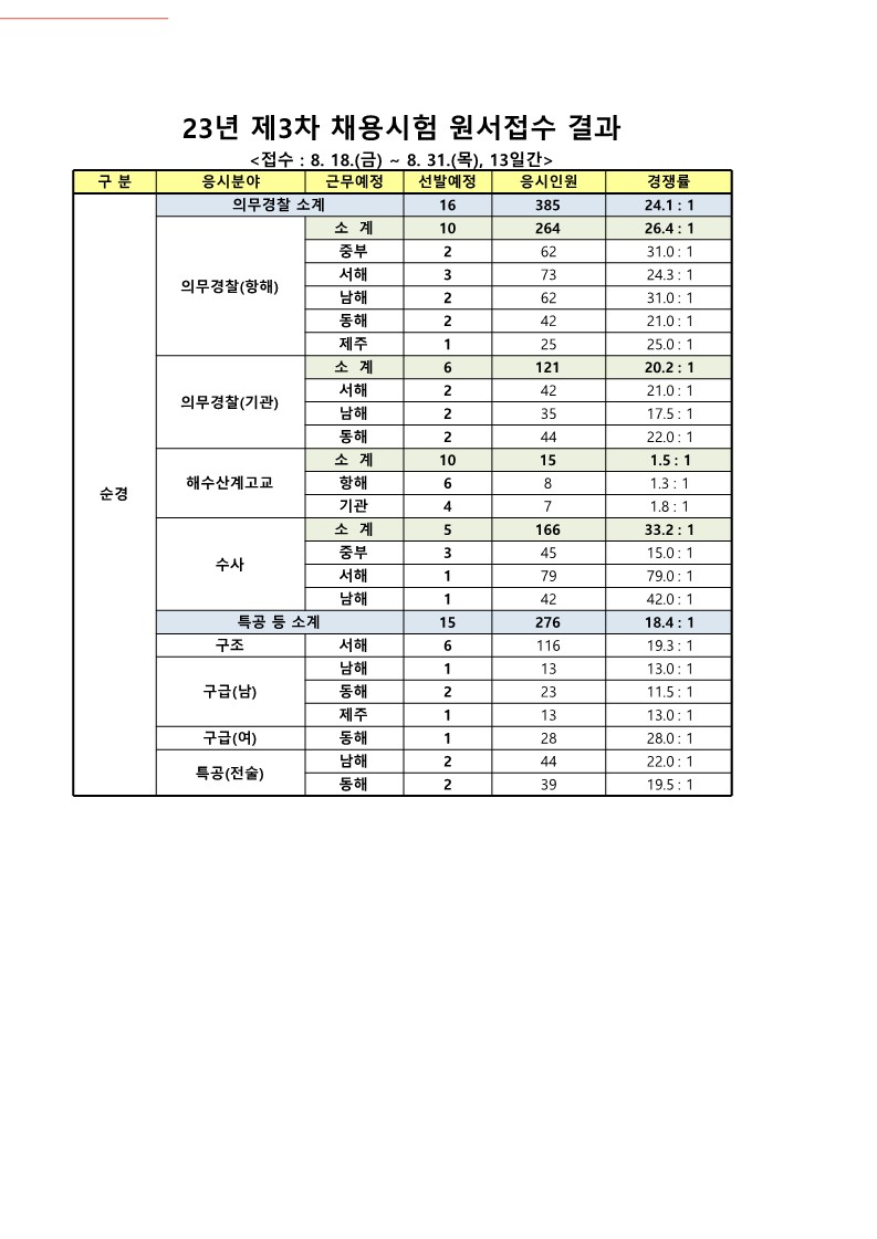 2023년 제3차 해양경찰청 소속 경찰공무원 원서접수결과 알림