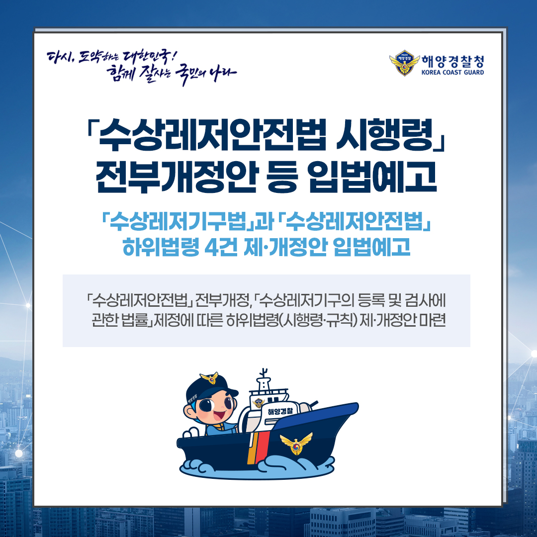 해양경찰청(청장 정봉훈)은 ’23년 6월 11일부터 시행되는 「수상레저기구의 등록 및 검사에 관한 법률」(이하 “「수상레저기구등록법」”이라 한다)과 「수상레저안전법」에 대한 하위법령(시행령・시행규칙) 제・개정안을 10월 21부터 12월 2일까지 입법예고하고, 국민들의 다양한 의견을 듣겠다고 밝혔다.