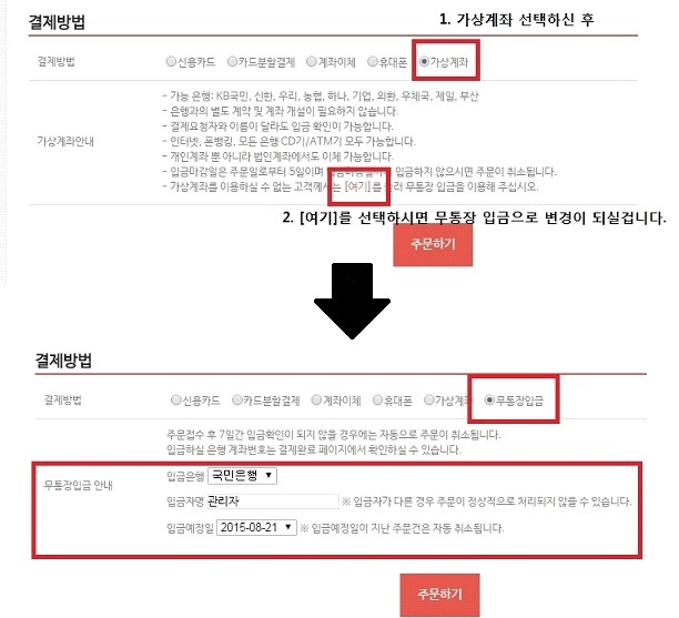 가상계좌은 구매주문완료 후 가상의 계좌에 해당 금액을 입금하는 방식입니다.