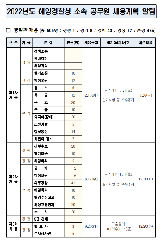 2022년도 해양경찰청 소속 공무원 채용계획 알림