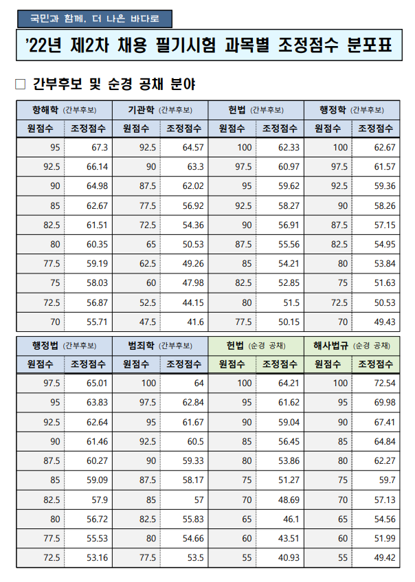 2022년 제2차 채용 필기시험 과목별 조정점수 분포표 알림