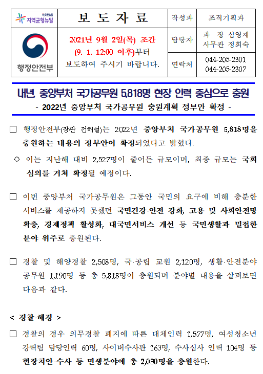 210902+(조간)+내년+중앙부처+국가공무원+5818명+현장+인력+중심으로+충원(조직기획과).hwp