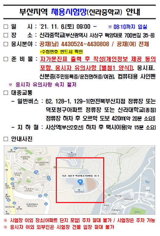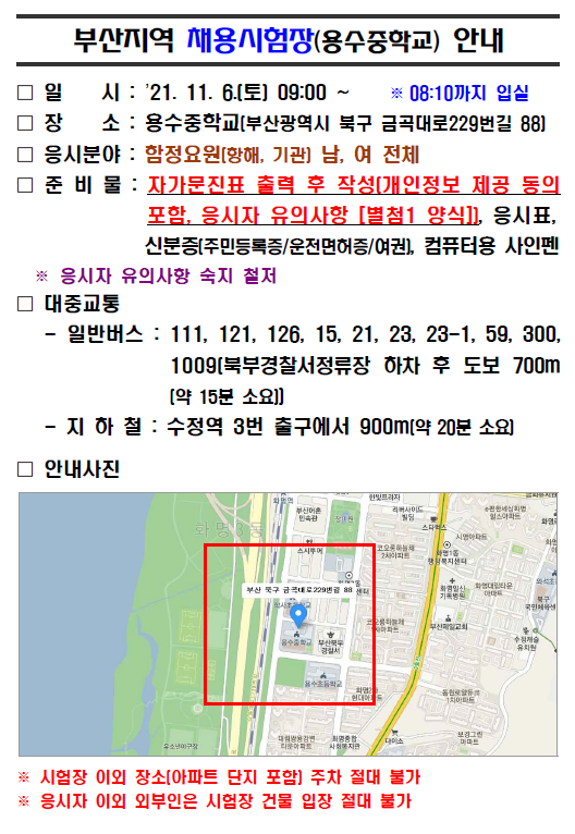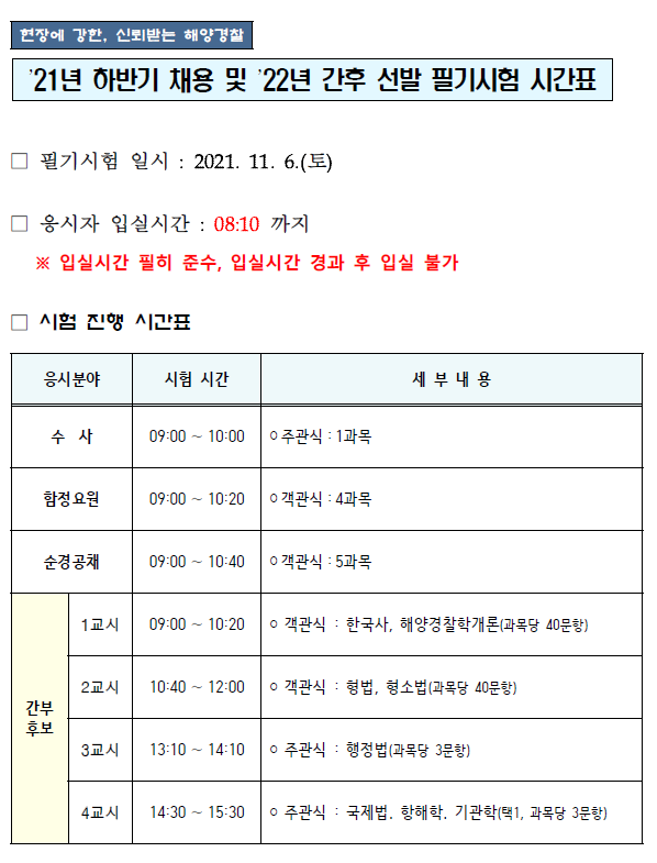 2021년 하반기 해양경찰 채용 필기시험장 안내 및 필기시험 시간표 공지