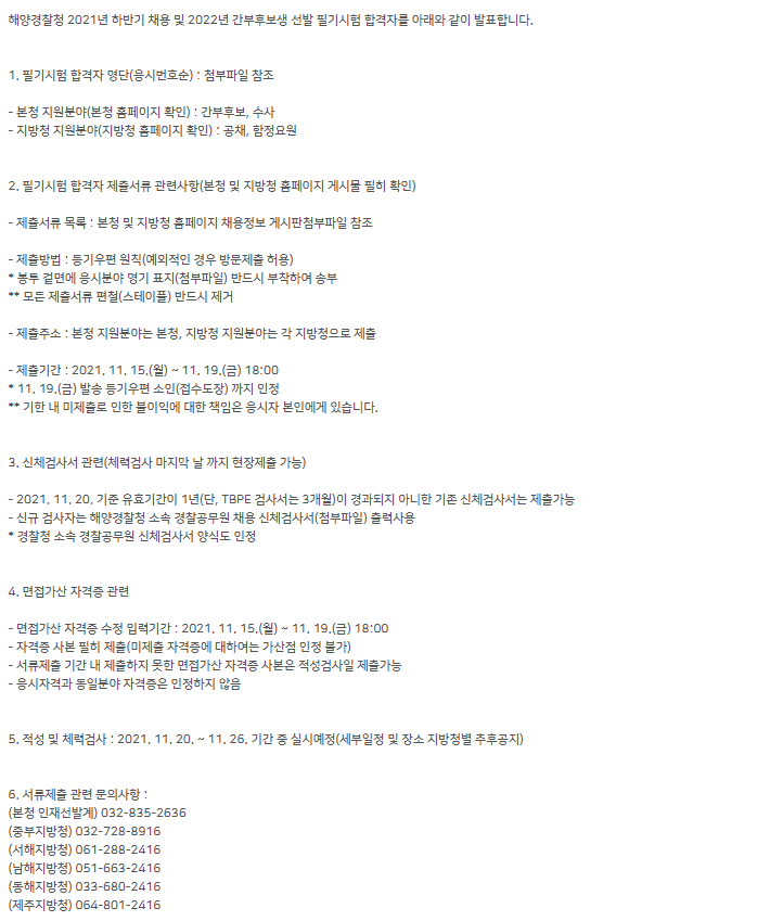 2021년 하반기 채용 및 2022년 간부후보생 선발 필기시험 합격자 알림