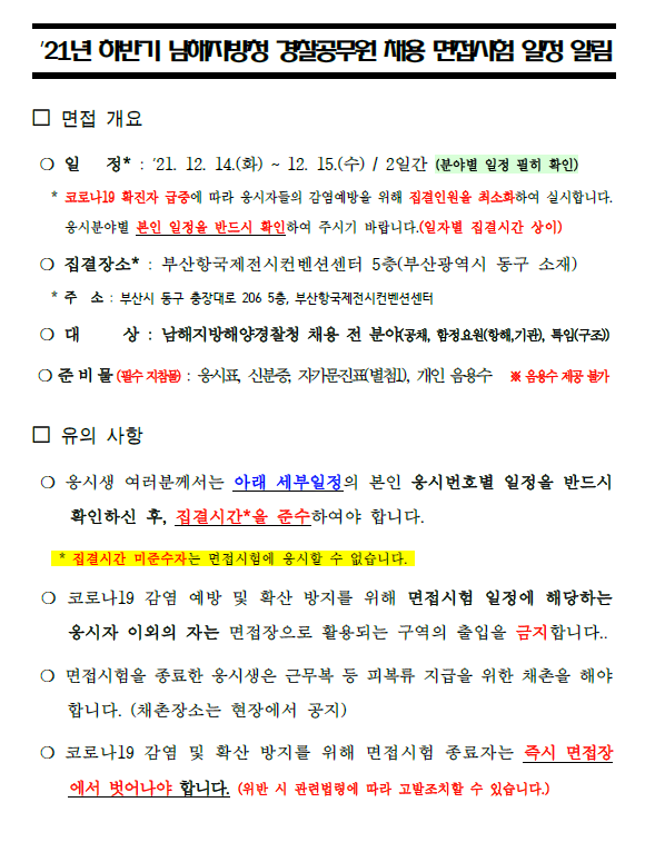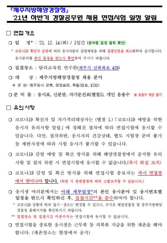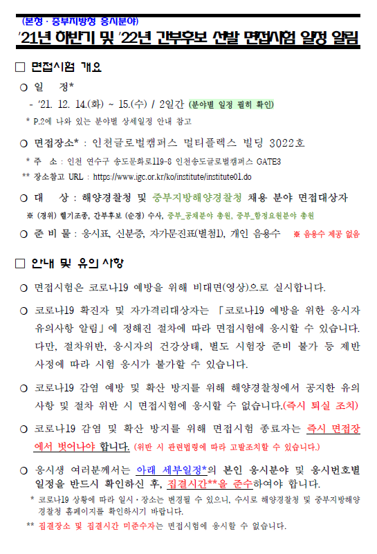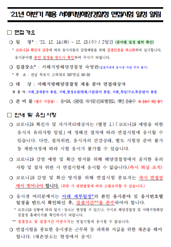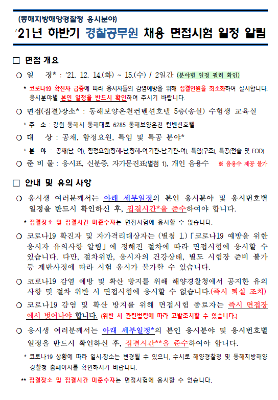 2021년 하반기 해양경찰 면접시험 일정을 다음과 같이 안내합니다