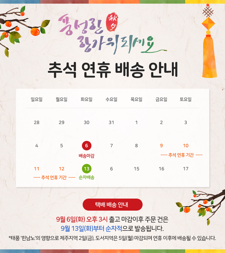 9월 9일부터 시작되는 추석 연휴 기간 고객센터 운영 및 택배 발송에 관해 안내 드립니다.